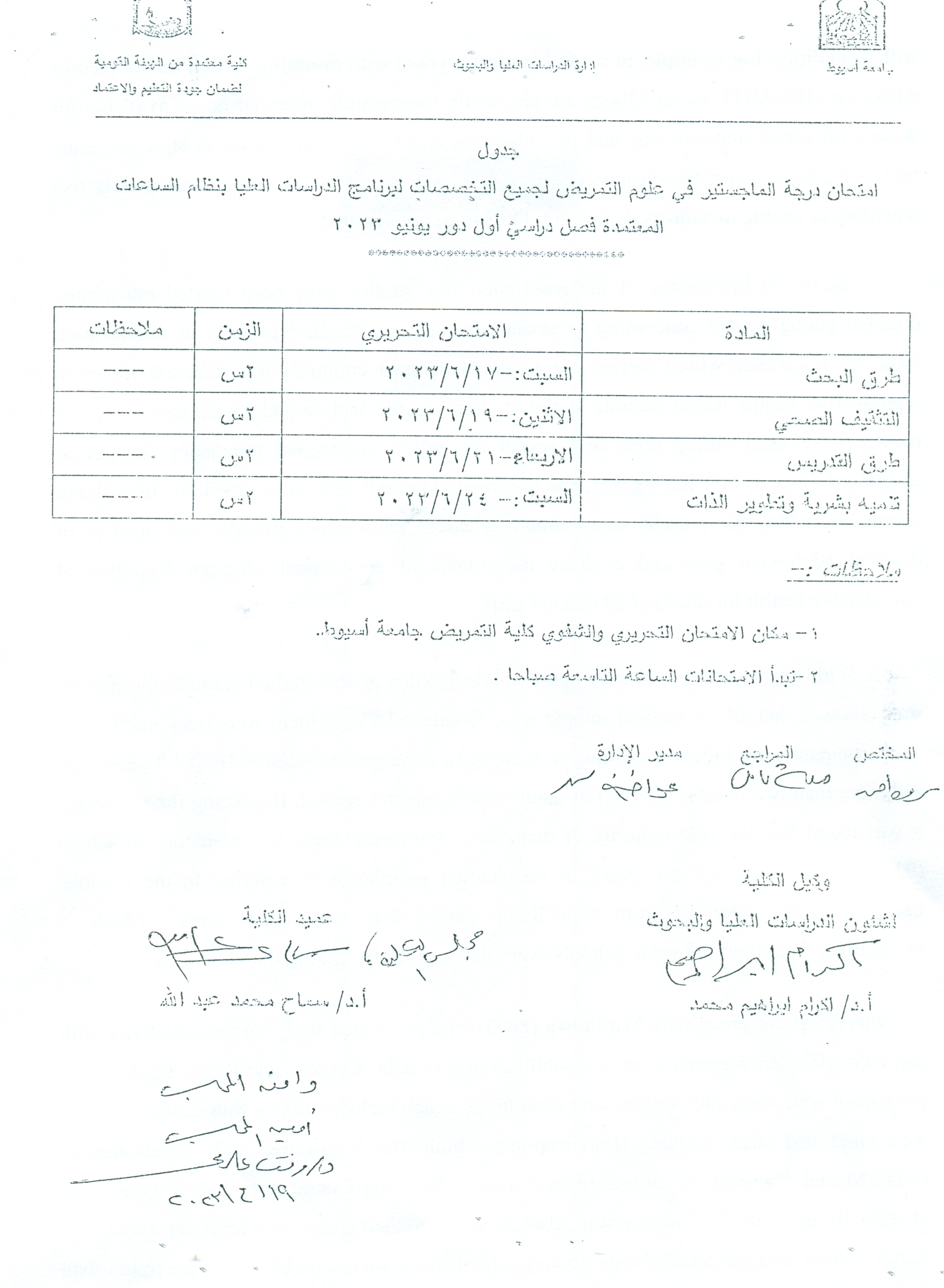 Master’s degree exam schedule in nursing sciences for all disciplines for the postgraduate program with the credit hour system, first semester, June 2023