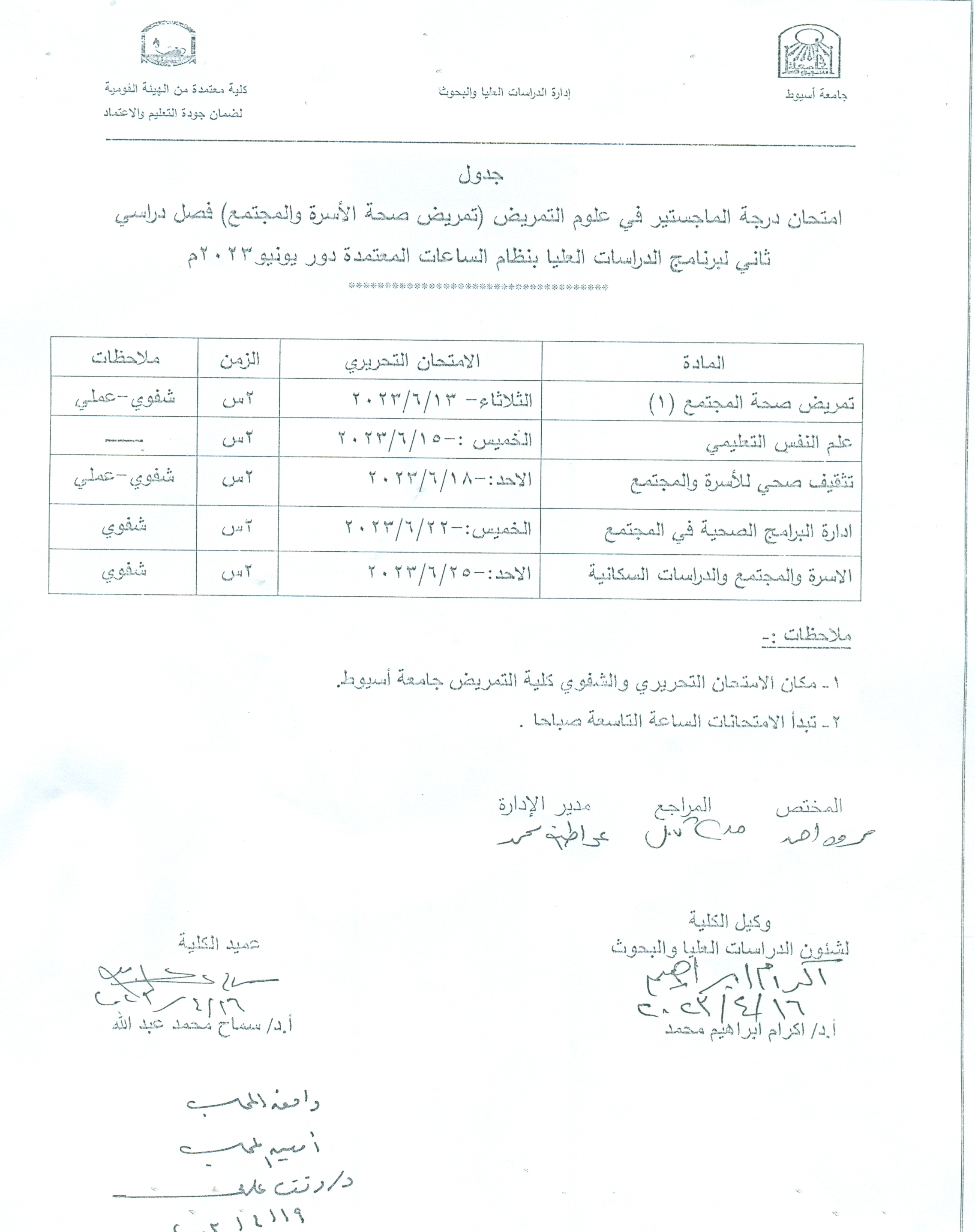 Master’s degree exam schedule in nursing sciences (family and community health nursing) second semester for the postgraduate program with the credit hour system, June 2023 session