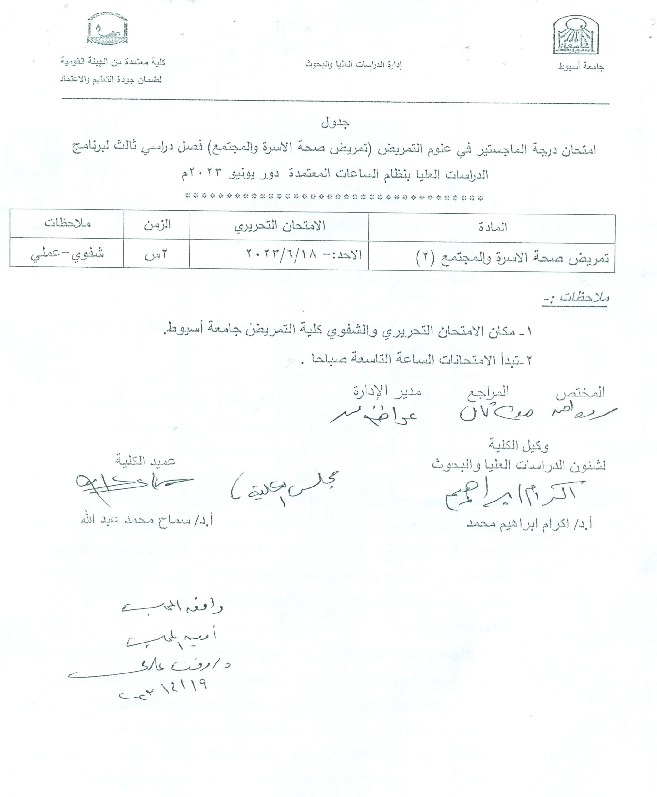 Master’s degree exam schedule in nursing sciences (family and community health nursing) third semester for the postgraduate program with the credit hour system, June 2023 session