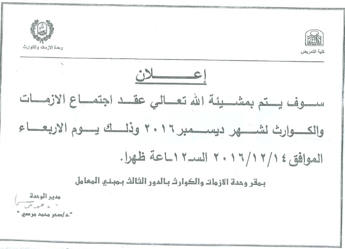 By God willing, meeting of crises and disasters committee chaired by Prof. Dr./ Sahar Mohamed Morsy will be held on Wednesday, 14/12/2016, at 12:00 noon, at Faculty of Nursing - Assiut University.