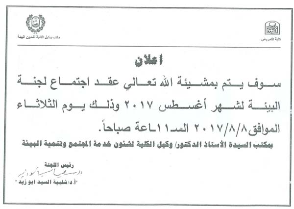 By God willing, meeting of environment committee chaired by Prof. Dr./ Shalabia EL-Sayed AboZead, Vice Dean for Community Services and Environmental Development, will be held on Tuesday, 8/8/2017, at 11:00 a.m., at the Faculty of Nursing - Assiut University.