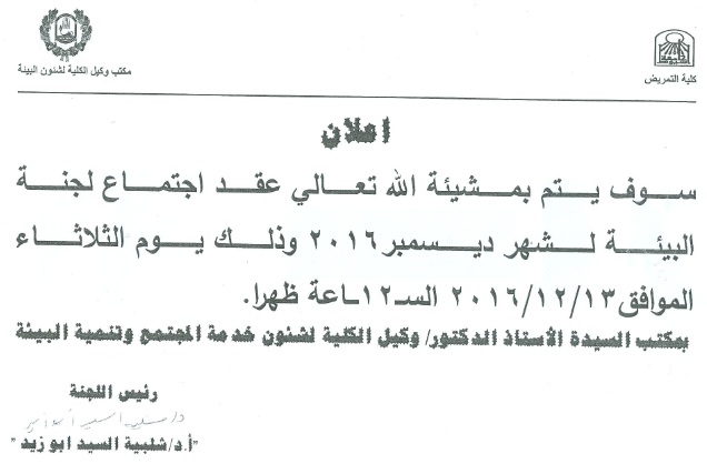 By God willing, meeting of environment committee chaired by Prof. Dr./ Shalabia EL-Sayed AboZead, Vice Dean for Community Services and Environmental Development, will be held on Tuesday, 13/12/2016, at 12:00 noon, at the Faculty of Nursing - Assiut University.