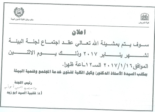 By God willing, meeting of environment committee chaired by Prof. Dr./ Shalabia EL-Sayed AboZead, Vice Dean for Community Services and Environmental Development, will be held on Monday, 16/1/2017, at 12:00 noon, at the Faculty of Nursing - Assiut University.