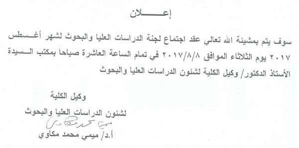 By God willing, meeting of the graduate studies committee chaired by Prof. Dr./ Mimi Mohamed Mekawy, Vice Dean for Graduate Studies and Research, will be held on Tuesday, 8/8/2017, at 10:00 a.m., at Faculty of Nursing - Assiut University.