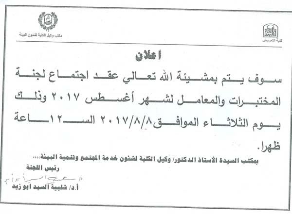 By God willing, meeting of laboratories committee chaired by Prof. Dr./ Shalabia EL-Sayed AboZead, Vice Dean for Community Services and Environmental Development, will be held on Tuesday, 8/8/2017, at 12:00 noon, at the Faculty of Nursing - Assiut University.