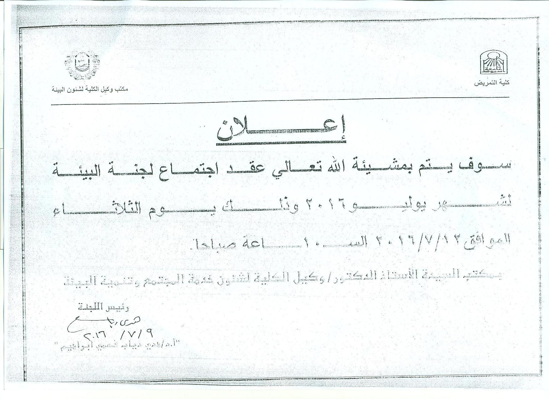 Meeting of Laboratories Committee of July 2016 12 July 2016 By God willing, meeting of laboratories committee chaired by Prof. Dr./ Huda Diab Fahmi will be held on Tuesday, 12/7/2016, at 10:00 a.m., at the Faculty of Nursing - Assiut University.
