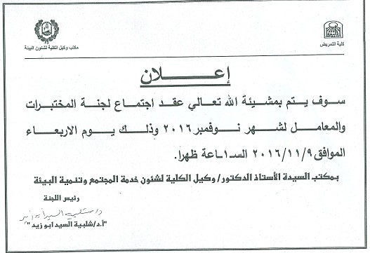 By God willing, meeting of laboratories committee chaired by Prof. Dr./ Shalabia EL-Sayed AboZead, Vice Dean for Community Services and Environmental Development, will be held on Wednesday, 9/11/2016, at 1:00 p.m., at the Faculty of Nursing - Assiut University.