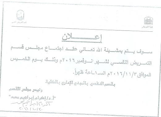 By God willing, meeting of psychiatric nursing department council chaired by Prof. Dr./ Ikram Ibrahim Mohamed, Head of the Department, will be held on Thursday, 3/11/2016, in the presence of teaching staff members of the department and their assistants at the department council hall.