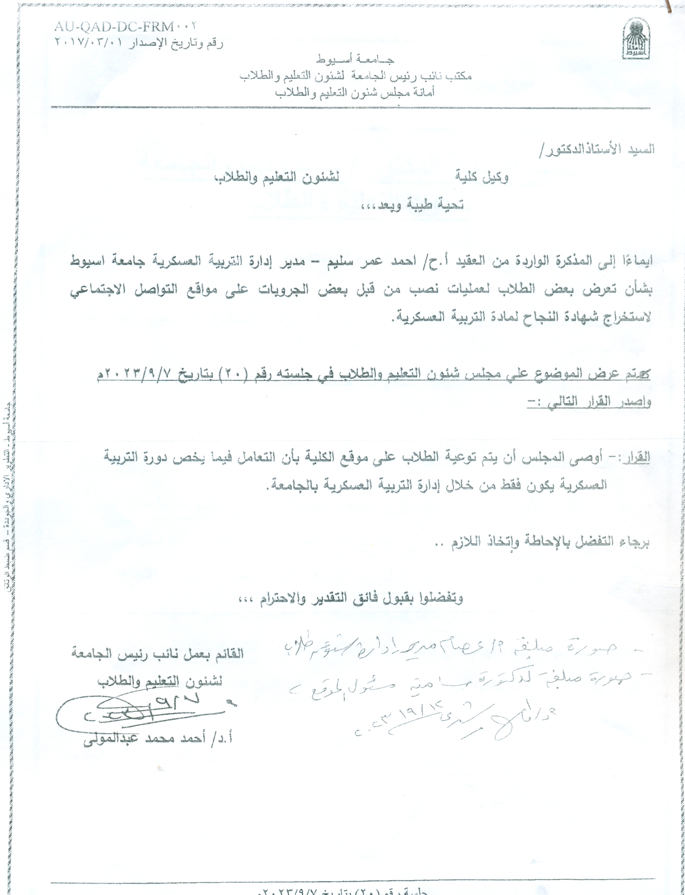 The memorandum received from Colonel A.H. Ahmed Omar Selim, Director of the Military Education Department, regarding the exposure of students to a scam by some groups.