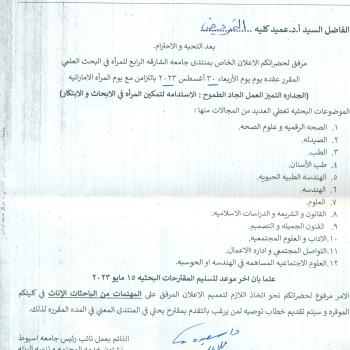 The announcement of the Fourth University of Sharjah Forum for Women in Scientific Research, to be held on Wednesday, August 30, 2023, in conjunction with Emirati Women's Day.