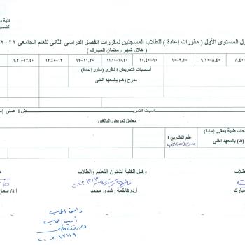 scedule of the first level (re-courses) for students registered for the courses of the second semester of the academic year 2022-2023 AD (during the holy month of Ramadan)