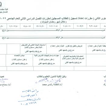 scedule of the second level, fourth semester of the academic year 2022-2023 AD (during the holy month of Ramadan)