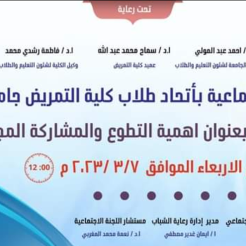 تتشرف اللجنة الاجتماعية بمجلس اتحاد طلاب الكلية التمريض-إدارة رعاية الشباب بدعوة جميع طلاب الكلية لحضور ندوة بعنوان أهمية التطوع والمشاركة المجتمعية والتي يحاضر بها السيد الاستاذ الدكتور منال…