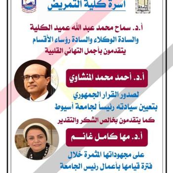 The family of the Faculty of Nursing congratulates Prof. Dr. Ahmed El-Minshawy on his appointment as President of Assiut University