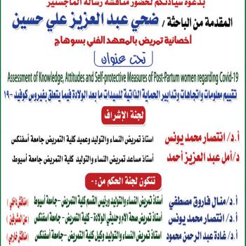 The master's thesis of the researcher / Afaf El-Sayed Abdel Aziz, a nursing specialist at the Technical Institute of Nursing at Sohag University, obtained an excellent grade