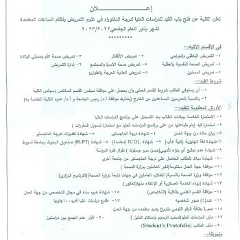 Announcement *** The faculty announces the opening of enrollment for postgraduate studies for a doctoral degree in nursing sciences, according to the credit hours system for the month of January for the academic year 2022/2023
