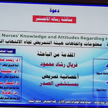 The master's thesis of the researcher / Feryal Rashad Mahmoud, a nursing specialist at Al-Sadr Hospital in Assiut, obtained an excellent grade