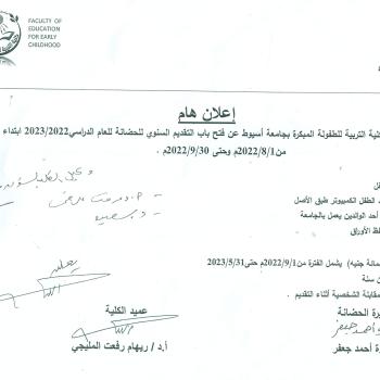 * Announcement *** Nursery School of Early Childhood Education at Assiut University about the opening of the annual progression for the nursery for the academic year 2023/2022