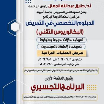 The Technical Institute of Nursing - Assiut University announces the acceptance of the fourth batch of the Specialized Diploma Program in Nursing, starting from 1/6/2022 to 1/8/2022