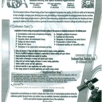 Announcement …..The National Authority for Remote Sensing and Space Sciences will organize the "First International Conference on Remote Sensing Applications and Space Sciences" during the period from 8 to 11 December 2022 at the Continental Hotel Hurghad