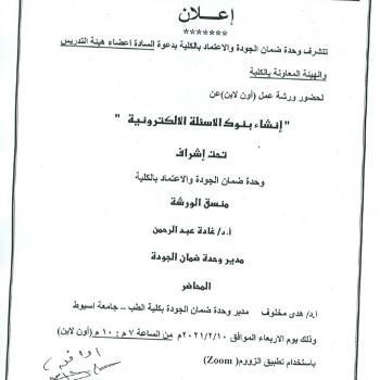 By God willing, meeting of libraries committee chaired by Prof. Dr./ Samah Mohamed Abdel-Allah, Faculty Dean, will be held on Tuesday, 9/2/2021, at Faculty of Nursing - Assiut University.