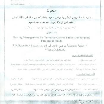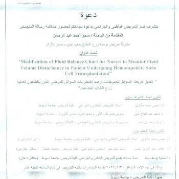 By God willing, Master thesis submitted by researcher/ Sahar Ahmed Abdel-Rahman, nursing specialist, will be discussed on Sunday, 31/1/2021, at 12:00 noon, at the conference hall of the college.…