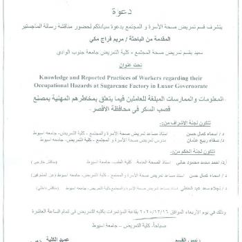 By God willing, Master thesis submitted by researcher/ Mariam Farag Meky - demonstrator, Department of Community Health Nursing, Faculty of Nursing, South Valley University - will be discussed on…
