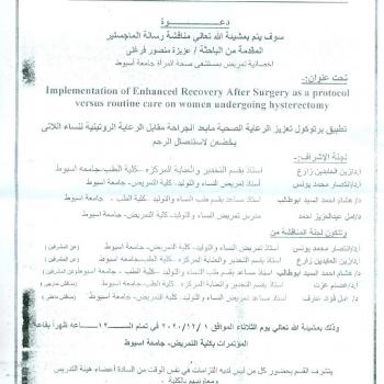 By God willing, meeting of research ethics committee chaired by Prof. Dr./ Marzouka Abdel-Aziz Gad Allah will be held on Sunday, 29/11/2020, at 10:00, at Faculty of Nursing - Assiut University.