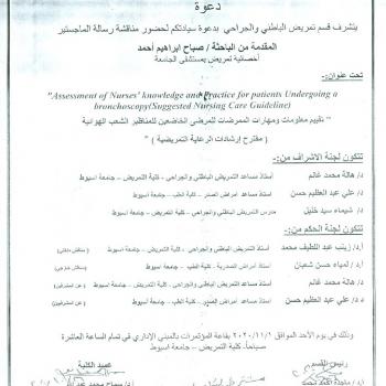 By God willing, master thesis submitted by researcher/ Sabah Ibrahim Ahmed, nursing specialist, will be discussed on Sunday 1/11/2020, at 10:00 a.m., at the conference hall of the college.