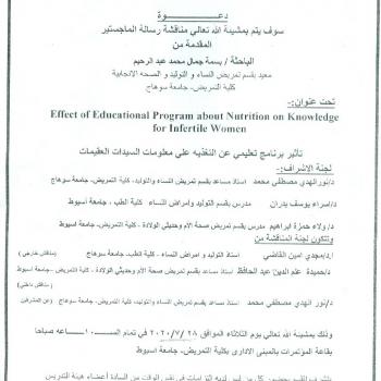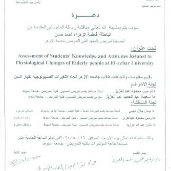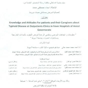 By God willing, master thesis submitted by researcher/ Asmaa Mustafa Mohamed, nursing specialist will be discussed on Wednesday, 12/8/2020, at 10:00 a.m., at the conference hall of the college.…
