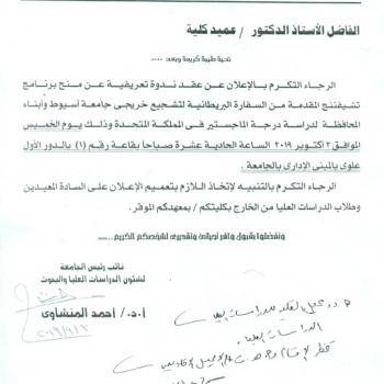 By God willing, meeting of the graduate studies committee chaired by Prof. Dr./ Mimi Mohamed Mekawy, Vice Dean for Graduate Studies and Research, will be held on Tuesday, 10/9/2019, at Faculty of…