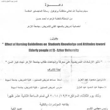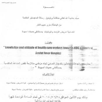 By God willing, the protocol of master thesis submitted by researcher/ Asmaa Abdel Hafez Abdel Ghani, nursing specialist, will be discussed on Wednesday, 18/12/2018, at 12:30 p.m., at the conference…