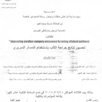 By God willing, the protocol of master thesis submitted by researcher/ Mariana Wajeh Naim, nursing specialist, will be discussed on Tuesday, 18/12/2018, at 12:00 noon, at the conference hall of the…