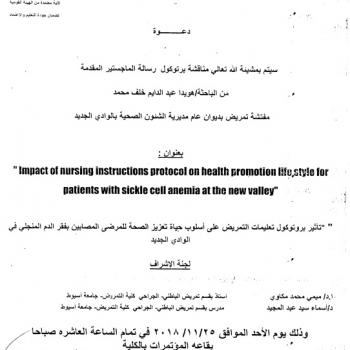 By God willing, master thesis submitted by researcher/ Amani Sayed Hassanein Allam, nursing specialist, will be discussed on Wednesday, 27/11/2018, at 11:00 a.m., at the conference hall of the…