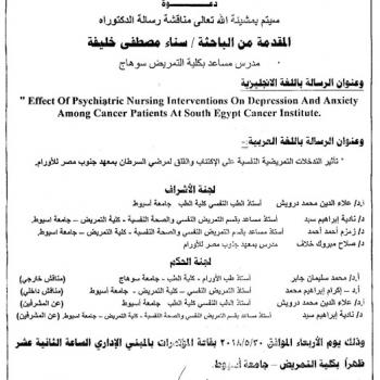 By God willing, doctoral thesis submitted by researcher/ Sanaa Mustafa Khalifa – Assistant lecturer, Faculty of Nursing, Assiut University - will be discussed on Wednesday, 30/5/2018, at 12:00 noon,…