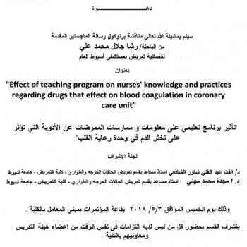By God willing, master thesis submitted by researcher/ Noura Mustafa Mahmoud, Nursing Specialist, will be discussed on Thursday, 3/5/2018, at 10:00 a.m., at the conference hall of the college.
