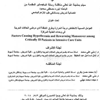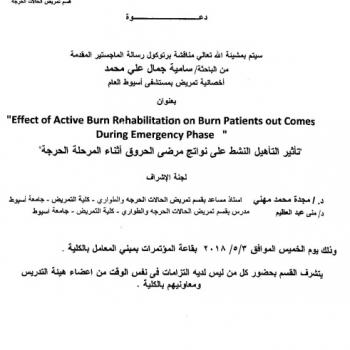 By God willing, the protocol of master thesis submitted by researcher/ Samia Gamal Ali Mohamed, nursing specialist, will be discussed on Thursday, 3/5/2018, at the conference hall of the college.…