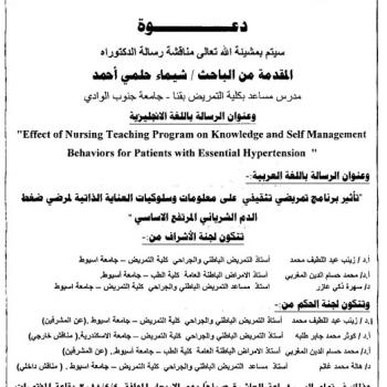 By God willing, doctoral thesis submitted by researcher/ Shymaa Helmy Ahmed – assistant lecturer, Faculty of Nursing, Qena- will be discussed on Wednesday, 4/4/2018, at 10:00 a.m., at the conference…