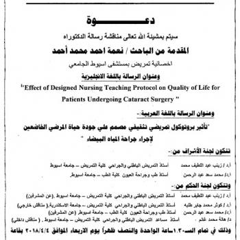 By God willing, the protocol of doctoral thesis submitted by researcher/ Susan Attallah Mohammed, Nursing Specialist, will be discussed on Thursday, 5/4/2018, at 11:00 a.m., at the conference hall of…