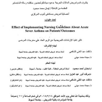 By God willing, master thesis submitted by researcher/ Eman Mohamed Mahmoud, nursing specialist, will be discussed on Sunday, 18/2/2018, at 11:00 a.m., at the conference hall of the college.
