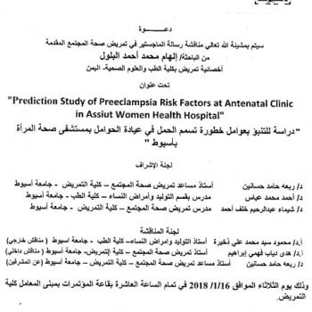 By God willing, master thesis submitted by researcher/ Elham Mohamed Ahmed El-Baloul - Nursing Specialist, Faculty of Medicine and Health Sciences, Yemen - will be discussed on Tuesday, 16/1/2018, at…