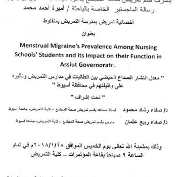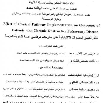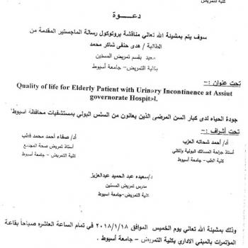 By God willing, the protocol of master thesis submitted by researcher/ Amira Ahmed Mohamed, Nursing Specialist, will be discussed on Thursday, 18/1/2018, at the conference hall of the college.