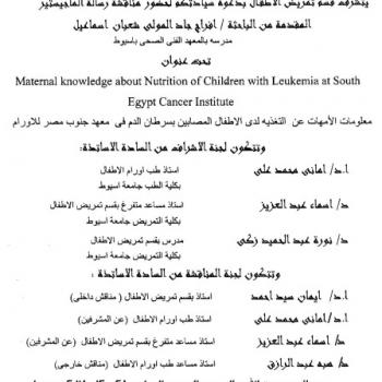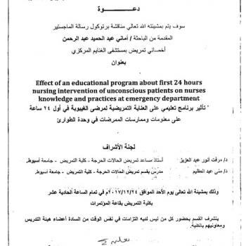 By God willing, the protocol of master thesis submitted by researcher/ Amany Abdel Hamid Abdel Rahman, Nursing Specialist, will be discussed on Sunday, 24/12/2017, at 11:00 a.m., at the conference…