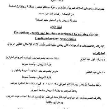 By God willing, the protocol of master thesis submitted by researcher/ Rasha Dergham Ali Mohamed, Nursing Specialist, will be discussed on Tuesday, 28/11/2017, at 10:00 a.m., at the conference hall…