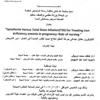 By God willing, master thesis submitted by researcher/ Warda Helmy Wasef, Nursing Specialist, will be discussed on Thursday, 30/11/2017, at 10:00 a.m., at the conference hall of the college.