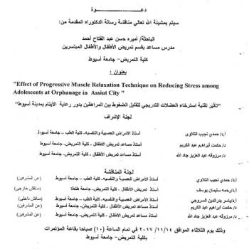 By God willing, doctoral thesis submitted by researcher/ Atiat Ahmed Seliman- assistant lecturer, Faculty of Nursing, Sohag University- will be discussed on Thursday, 16/11/2017, at 1:00 p.m., at the…