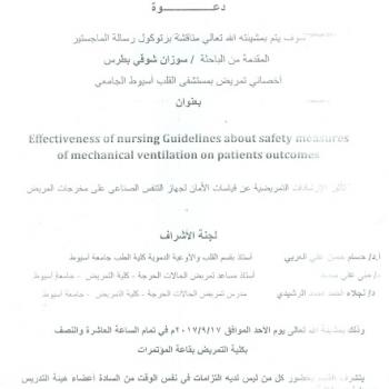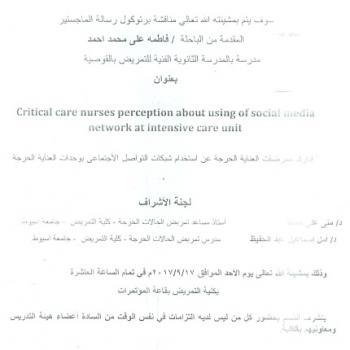 By God willing, the protocol of master thesis submitted by researcher/ Shaimaa Mohamed Hasab Allah, Nursing Specialist, will be discussed on Sunday, 17/9/2017, at 11:00 a.m., at the conference hall…