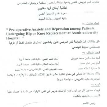 By God willing, the protocol of master thesis submitted by researcher/ Hanan Faried Maghawry- Demonstrator, Psychiatric Nursing Department, Faculty of Nursing, Assiut University- will be discussed on…