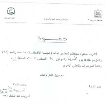 By God willing, meeting of career's ethics committee chaired by Prof. Dr./ Zainab Abdel-Latif Mohamed, Faculty Dean, will be held on Tuesday, 8/8/2017, at 11:30 a.m., at Faculty of Nursing - Assiut…