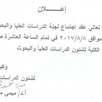 By God willing, meeting of the graduate studies committee chaired by Prof. Dr./ Mimi Mohamed Mekawy, Vice Dean for Graduate Studies and Research, will be held on Tuesday, 8/8/2017, at 10:00 a.m., at…